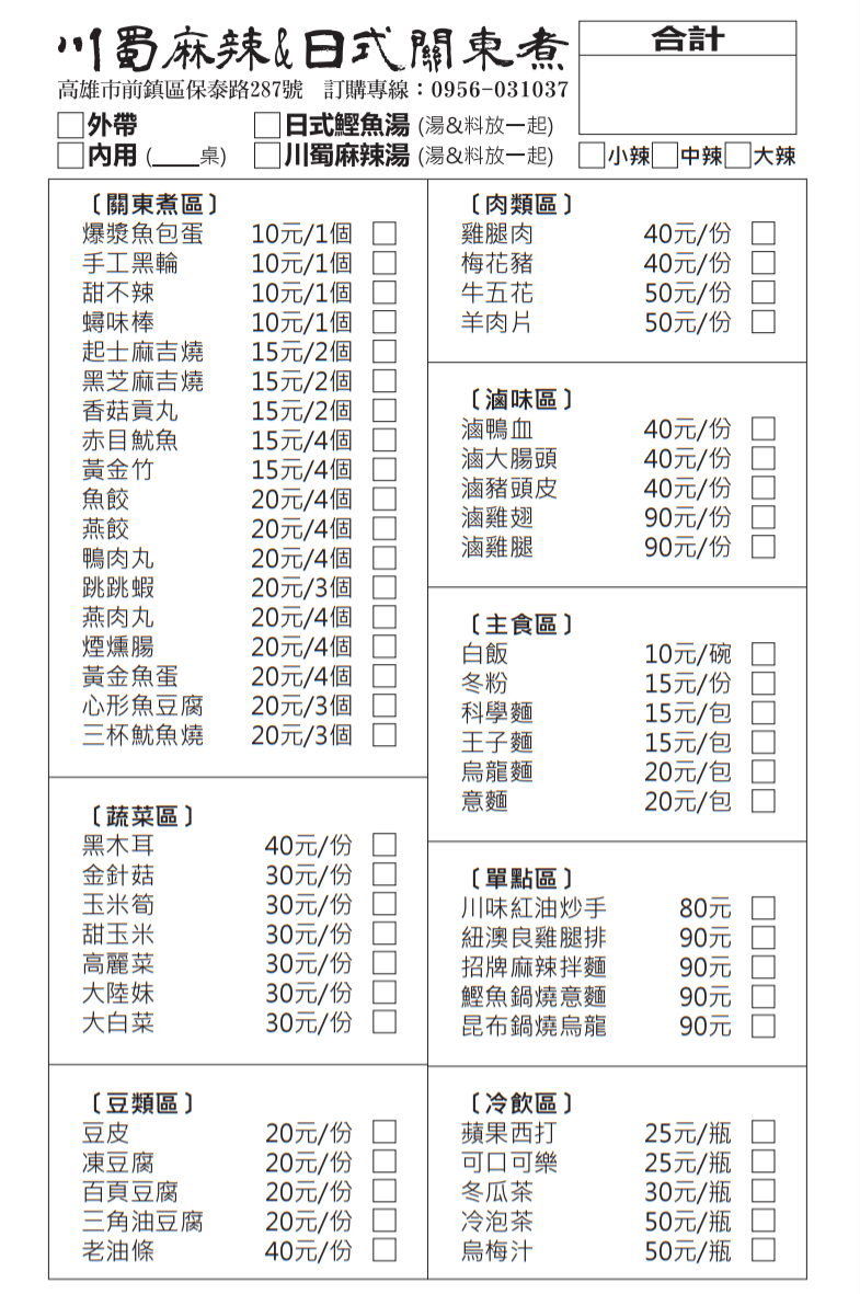 川蜀風味火鍋(麻辣燙&日式關東煮)MENU