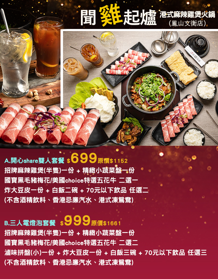以正宗港式麻辣雞煲火鍋為料理特色的【港式聞雞起爐麻辣雞煲火鍋】,與夠麻吉攜手推出超值優惠啦!將香港超夯的一鍋兩吃引進,讓一爐美味,藉由兩種不同吃法,而有不同風味!