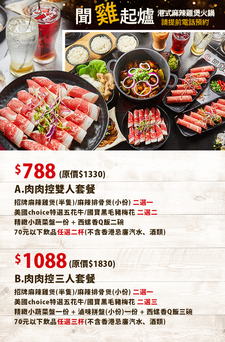 〈招牌麻辣雞煲(半隻)/麻辣排骨煲(小份) 二選一 + 美國choice特選五花牛/國寶黑毛豬梅花 二選二 + 精緻小蔬菜盤一份 + 西螺香Q飯二碗 + 70元以下飲品任選二杯(不含香港忌廉汽水、酒類)〉