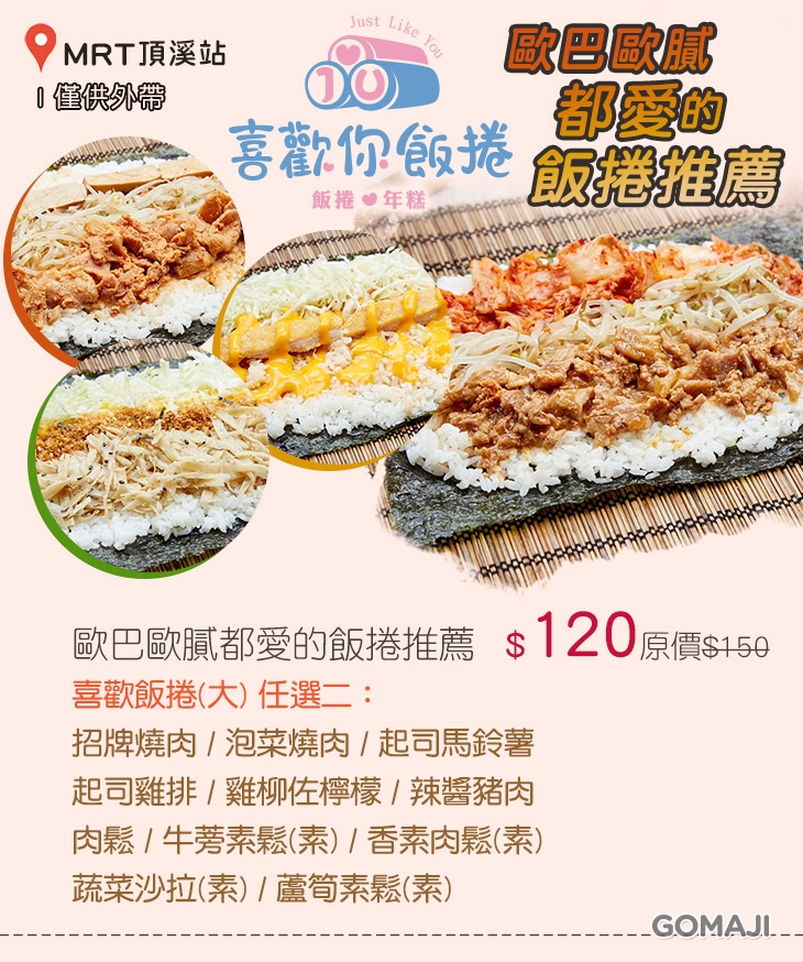 位於捷運頂溪站附近的「喜歡你-韓式飯捲/年糕」,專賣美味的韓式飯捲和年糕,品項十分豐富。招牌以可愛的圖樣作為品牌識別,搭配上"喜歡你"的文字,看起來就像對經過的人們說著:「這是我給你的一點點心意。」如此用心的含意,不僅讓人感到心裡溫暖,還能品嚐到熱呼呼的現做飯捲,店員將豐富配料大方地包夾在海苔飯捲中,超澎湃的美味,在韓劇中也時常出現,現在不用特別飛出國就能享用到囉 ~ 喜歡韓式口味的你,一定要來品嚐看看!:)