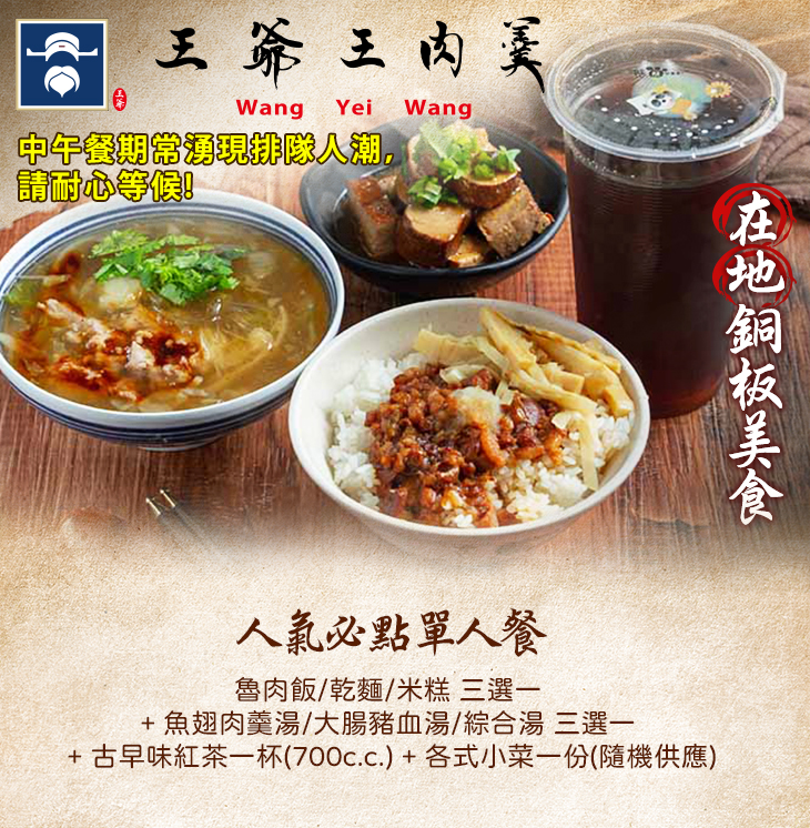 〈魯肉飯/乾麵/米糕 三選一 + 魚翅肉羹湯/大腸豬血湯/綜合湯 三選一 + 古早味紅茶一杯(700c.c.) + 各式小菜一份(隨機供應)〉