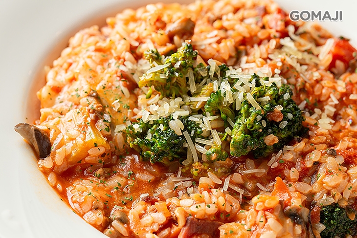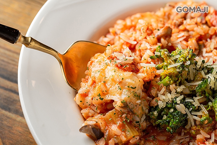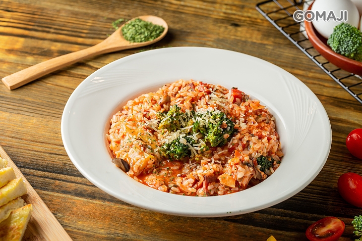 特製紅醬培根蘑菇燉飯,以紅醬為基底,加入新鮮蘑菇佐鹹香培根、飯調味烹煮而成。色香味俱全,入口濕潤濃郁酸甜的滋味,無論大人、小孩都吃得津津有味且為之著迷喔 ~