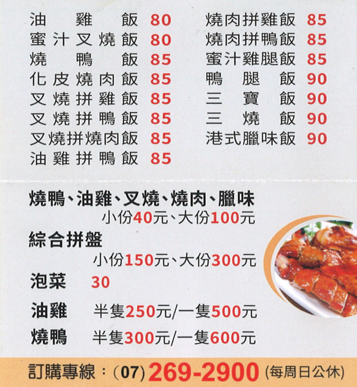 餐點美味,用料實在且新鮮!將道地的港式燒臘料理結合南部人的熱情,噴香獻上給您!將港式燒臘料理原汁原味完美呈現,再經過自家廚藝琢磨後,讓燒臘料理那既獨特又迷人的〝美味〞聲名遠播!在菜色上精心挑選調配、烹飪手法上則細心專研,如此用心,難怪每每營業時間一到人潮總是源源不絕!