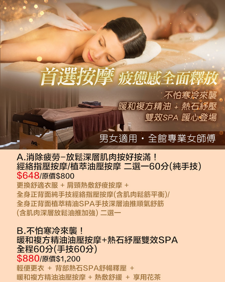 A.消除疲勞-放鬆深層肌肉按好按滿!經絡指壓按摩/植萃油壓按摩 二選一60分(純手技) / B.不怕寒冷來襲!暖和複方精油油壓按摩+熱石紓壓雙效SPA全程60分(手技60分)