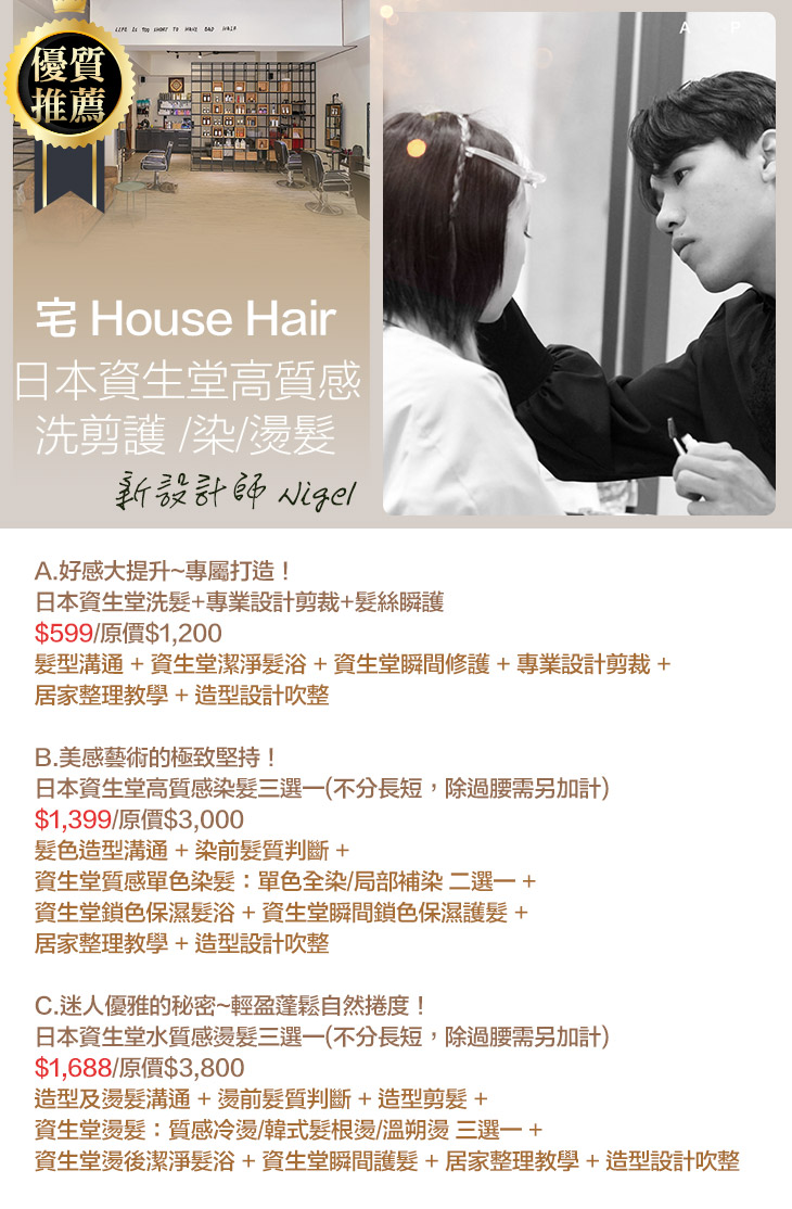 A.好感大提升~專屬打造!日本資生堂洗髮+專業設計剪裁+髮絲瞬護 / B.美感藝術的極致堅持!日本資生堂高質感染髮三選一(不分長短,除過腰需另加計) / C.迷人優雅的秘密~輕盈蓬鬆自然捲度!日本資生堂水質感燙髮三選一(不分長短,除過腰需另加計)