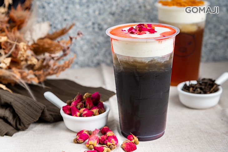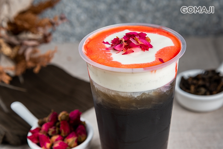 使用健康養生的天然竹炭與台灣產小種烏龍茶結合,烏黑亮眼的茶色,巧妙搭配對比的雪白奶蓋,再以花香高雅的玫瑰醬與玫瑰點綴,打造絕美的華麗暗黑氣質,讓茶飲不僅是解饞、止渴,更是一杯藝術作品!