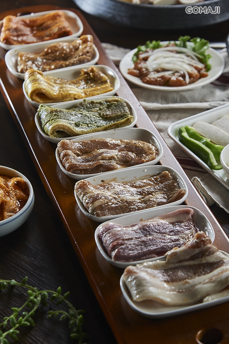 更有韓國味的「八色烤肉」,分別以大蒜、松葉、香草、咖哩、大醬、辣椒醬、高麗人參及葡萄酒醃製而成的肥美五花肉,各自呈現著其獨特的色澤,八種不同的風味、色彩,帶來千變萬化的味蕾饗宴,讓您怎麼吃,都吃不膩!五花肉豐厚甘醇的油花芬芳,與醃料專屬的香氣緊緊結合,豐富的層次口感,就是比一般的銅盤烤肉還要好吃!您可千萬不要錯過這特別的美味!