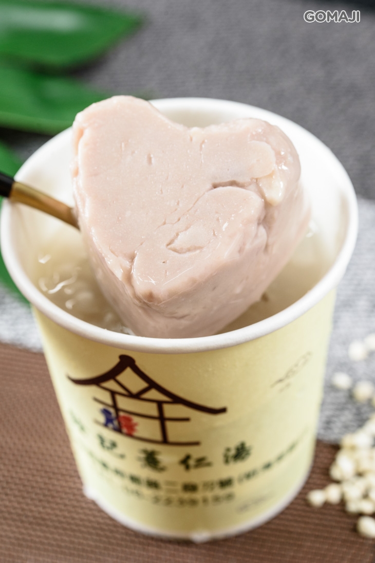 而主角「偶泥」,可是精選了甜度、口感最佳的上品芋頭,製成泥後再壓成一顆獨具巧思的愛心造型,過程中絕不添加一滴水的作法,讓芋頭天然的甜味被完整保留下來,紮實卻又入口即化的口感,隨著薏仁湯於齒唇間綻放清甜不膩的滋味,讓人愛不釋口!