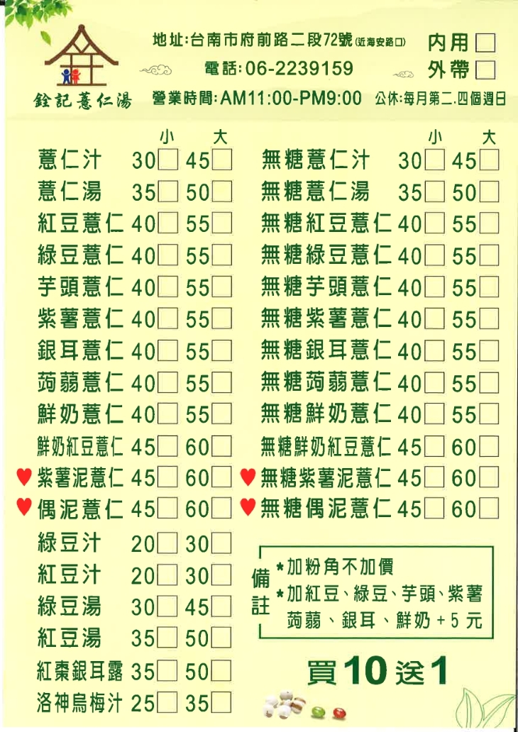 百嚐不膩的紅豆與綠豆,一直都是台式甜湯中經典必吃的品項!手工熬煮的紅豆料與綠豆料,天然無添加,讓豆中最天然的甜味發揮的淋漓盡致,紮實且飽足的份量,佐入清香甘甜的薏仁湯中一起享用,傳統且古早的滋味,讓人欲罷不能!