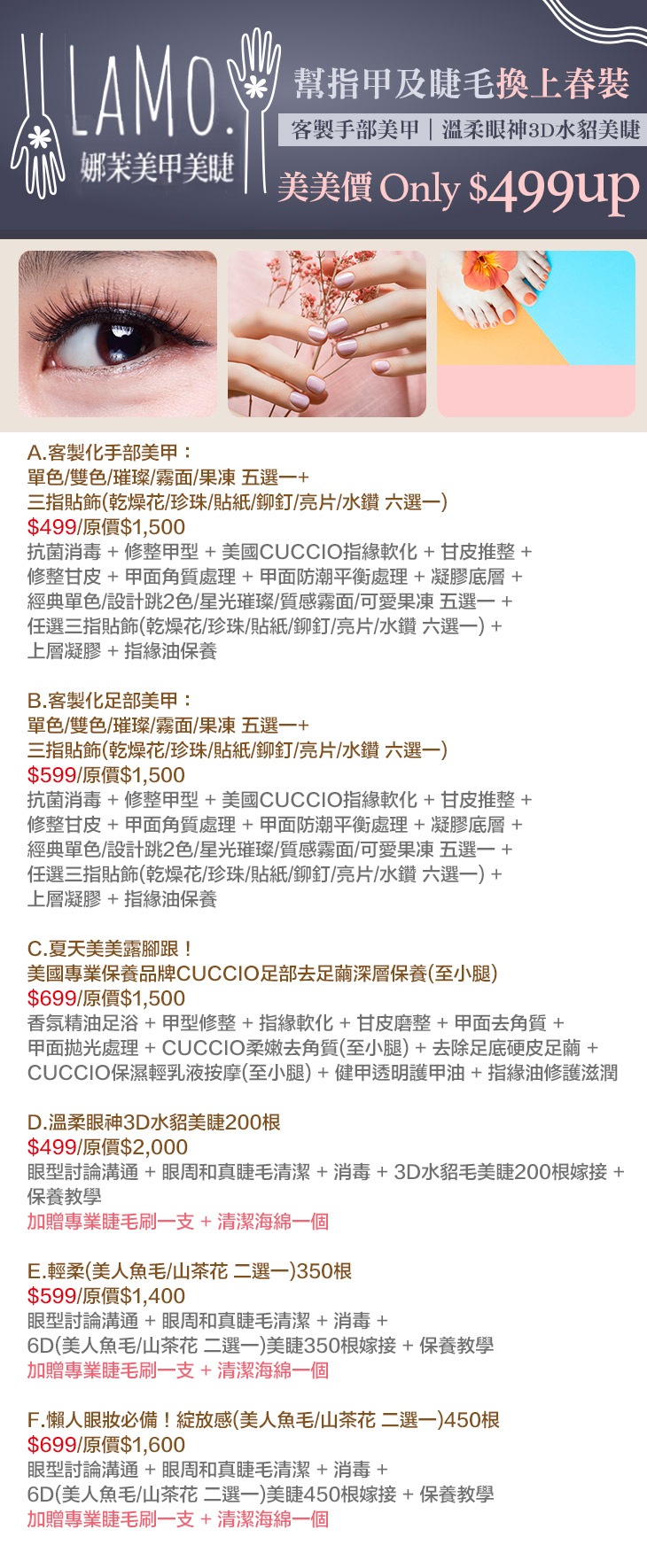 A.客製化手部美甲:單色/雙色/璀璨/霧面/果凍 五選一+三指貼飾(乾燥花/珍珠/貼紙/鉚釘/亮片/水鑽 六選一)/B.客製化足部美甲:單色/雙色/璀璨/霧面/果凍 五選一+三指貼飾(乾燥花/珍珠/貼紙/鉚釘/亮片/水鑽 六選一)/C.夏天美美露腳跟!美國專業保養品牌CUCCIO足部去足繭深層保養(至小腿)/D.溫柔眼神3D水貂美睫200根/E.輕柔(美人魚毛/山茶花 二選一)350根/F.懶人眼妝必備!綻放感(美人魚毛/山茶花 二選一)450根