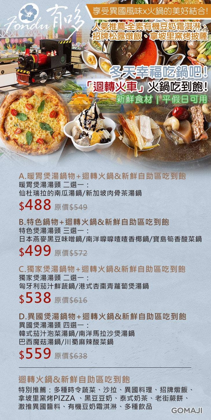 數十種不同風味的全素湯底,呈現各有千秋的美味,搭配由「迴轉火車」運送-選擇豐富、有甜有鹹的異國料理、甜點、麵包、冰品及飲品,還有自助區新鮮、豐盛的原型食物、蔬果、香料、醬料…等,各種美味點綴如萬花筒般千變萬化的味蕾饗宴,百嚐不膩!