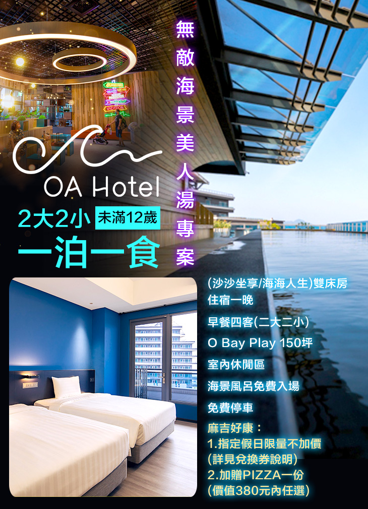 ★ 2大2小(未滿12歲)一泊一食,加贈PIZZA乙份,入住無敵海景飯店OA HOTEL,冬天泡美人湯,步行可達烏石港海灘,衝浪主題潮旅宿。