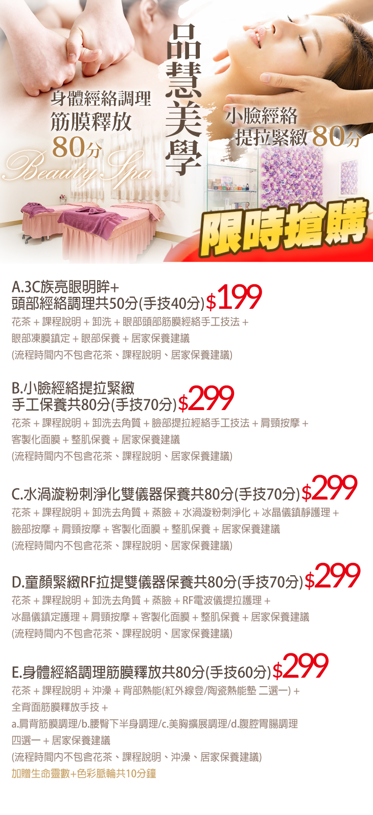 A.3C族亮眼明眸+頭部經絡調理共50分(手技40分) / B.小臉經絡提拉緊緻手工保養共80分(手技70分) / C.水渦漩粉刺淨化雙儀器保養共80分(手技70分) / D.童顏緊緻RF拉提雙儀器保養共80分(手技70分) / E.身體經絡調理筋膜釋放共80分(手技60分)