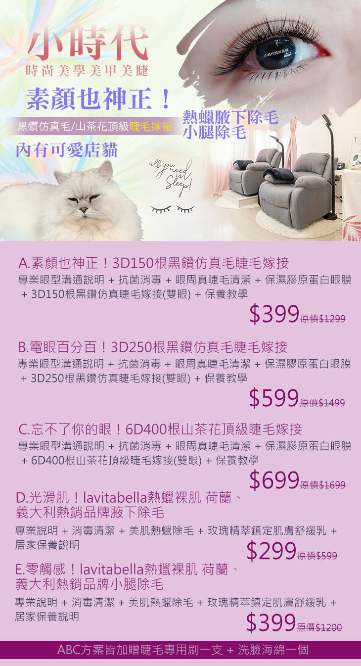 A.素顏也神正!3D150根黑鑽仿真毛睫毛嫁接 / B.電眼百分百!3D250根黑鑽仿真毛睫毛嫁接 / C.忘不了你的眼!6D400根山茶花頂級睫毛嫁接 / D.光滑肌!lavitabella熱蠟裸肌 荷蘭、義大利熱銷品牌腋下除毛 / E.零觸感!lavitabella熱蠟裸肌 荷蘭、義大利熱銷品牌小腿除毛