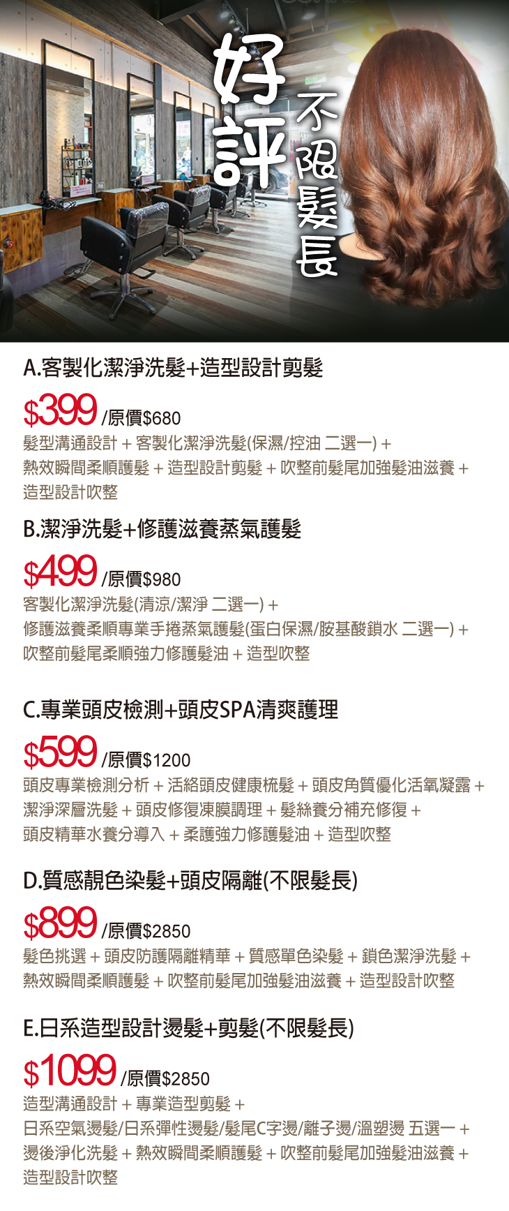 A.客製化潔淨洗髮+造型設計剪髮 / B.潔淨洗髮+修護滋養蒸氣護髮 / C.專業頭皮檢測+頭皮SPA清爽護理 / D.質感靚色染髮+頭皮隔離(不限髮長) / E.日系造型設計燙髮+剪髮(不限髮長)