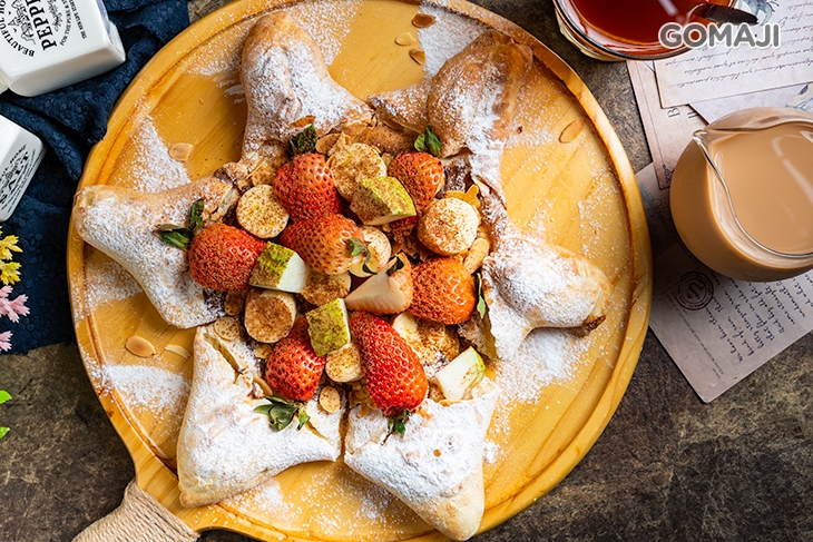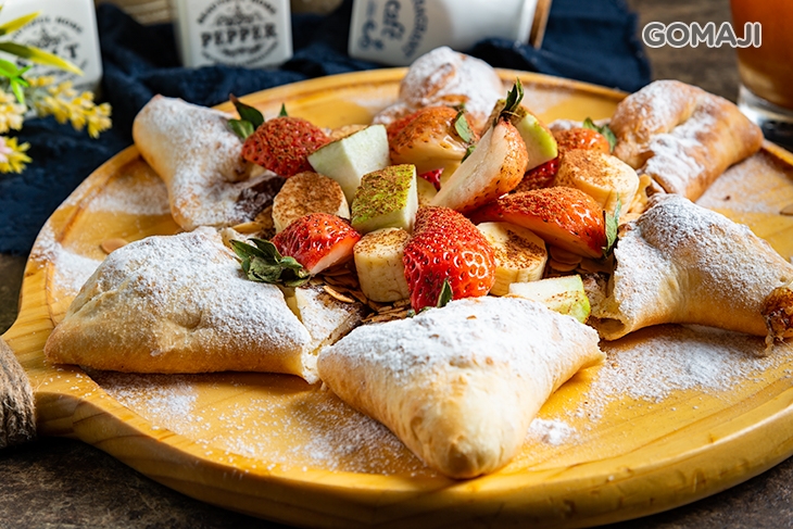 還有這道 - 甜比薩,可是老饕推薦必點的私房美味喔!造型宛如派大星的現烤比薩,上頭鋪上滿滿的時令鮮果,五顏六色、色彩繽紛!刀叉切下,取片品嚐,餅皮紮實富有嚼勁的口感,配上口味多元又多汁的水果與糖粉,酸酸甜甜、層次豐富、美味程度一百分!