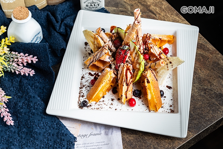 現烤鬆餅出爐囉!搭配餅乾、水果、巧克力淋醬等精選食材組合而成的美味鬆餅,一口咬下,外酥內軟、鬆軟酥香的口感配上豐盛的配料,讓人瞬間擁有戀愛般的感覺!單點一份再搭配超值組合,有吃有喝,幸福又快樂!