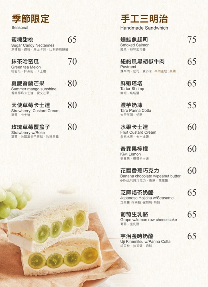 ※手工三明治依季節時令調整,實際菜色、價目依現場提供為主。