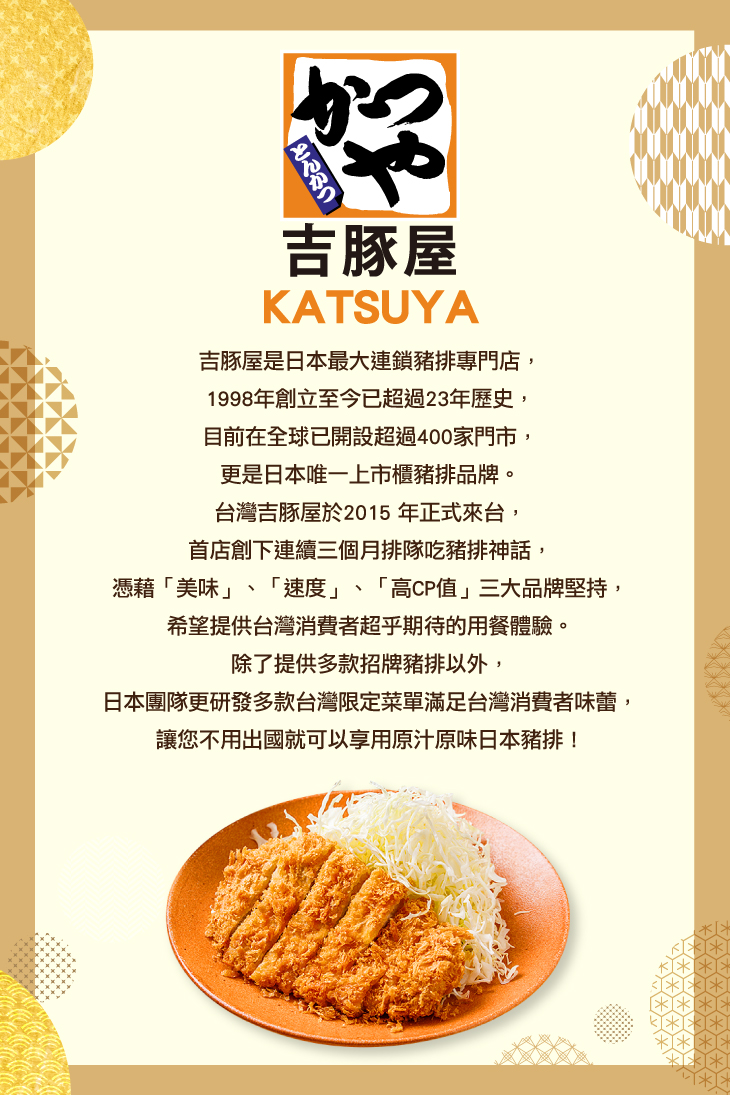 ◆ 獨家麵包粉:採用日本直輸特製麵衣,以特殊烘培製法,研製炸豬排專屬吐司麵衣。有別一般麵包粉以吐司邊製成,吉豚屋麵衣以整條吐司特製,每一口都能品嚐原汁原味、卡滋卡滋的日式經典。