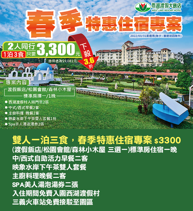 坐落國際慢城三義的西湖渡假村,緊鄰中山高三義交流道,交通便利,60公頃的偌大園區,山林蓊鬱、花木扶疏、空氣清新,更是樂活紓壓的渡假勝地!其中,以歐式風格建造的西湖渡假大飯店,提供雙人房及四人房,搭配主題活動與四季更迭的美景,不論親子出遊、情侶約會、親友相聚都十分適宜。