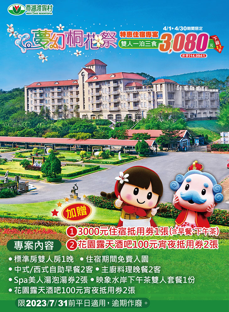 坐落國際慢城三義的西湖渡假村,緊鄰中山高三義交流道,交通便利,60公頃的偌大園區,山林蓊鬱、花木扶疏、空氣清新,更是樂活紓壓的渡假勝地!其中,以歐式風格建造的西湖渡假大飯店,提供雙人房及四人房,搭配主題活動與四季更迭的美景,不論親子出遊、情侶約會、親友相聚都十分適宜。