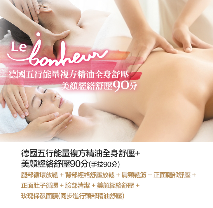 ♥ 德國五行能量複方精油全身舒壓+美顏經絡舒壓90分(手技90分)