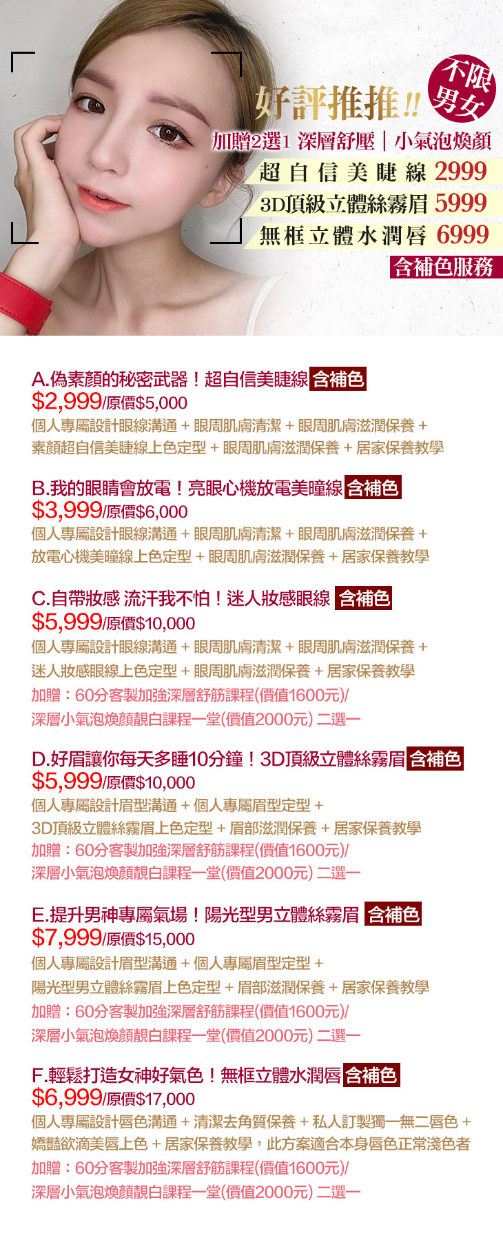 A.偽素顏的秘密武器!超自信美睫線(含補色) / B.我的眼睛會放電!亮眼心機放電美曈線(含補色) / C.自帶妝感 流汗我不怕!迷人妝感眼線(含補色) / D.好眉讓你每天多睡10分鐘!3D頂級立體絲霧眉(含補色) / E.提升男神專屬氣場!陽光型男立體絲霧眉(含補色) / F.輕鬆打造女神好氣色!無框立體水潤唇(含補色)