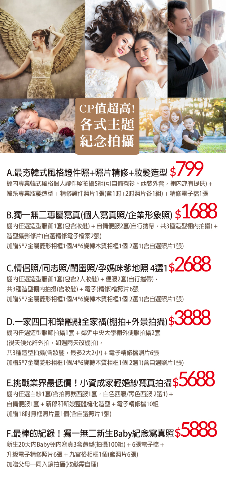 A.最夯韓式風格證件照+照片精修+妝髮造型 / B.獨一無二專屬寫真(個人寫真照/企業形象照) / C.情侶照/同志照/閨蜜照/孕媽咪爹地照 4選1 / D.一家四口和樂融融全家福(棚拍+外景拍攝) / E.挑戰業界最低價!小資成家輕婚紗寫真拍攝 / F.最棒的紀錄!獨一無二新生Baby紀念寫真照