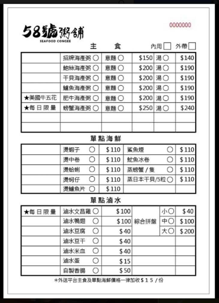 用料新鮮實在!不得不推!近臺中市體育場!專營海產粥、意麵及單點海鮮、單點滷水的【58號粥舖】,每道料理,所選用的食材,都是正港ㄟ新鮮!堅持與固定廠商合作,來確保品質的衛生與安全。
