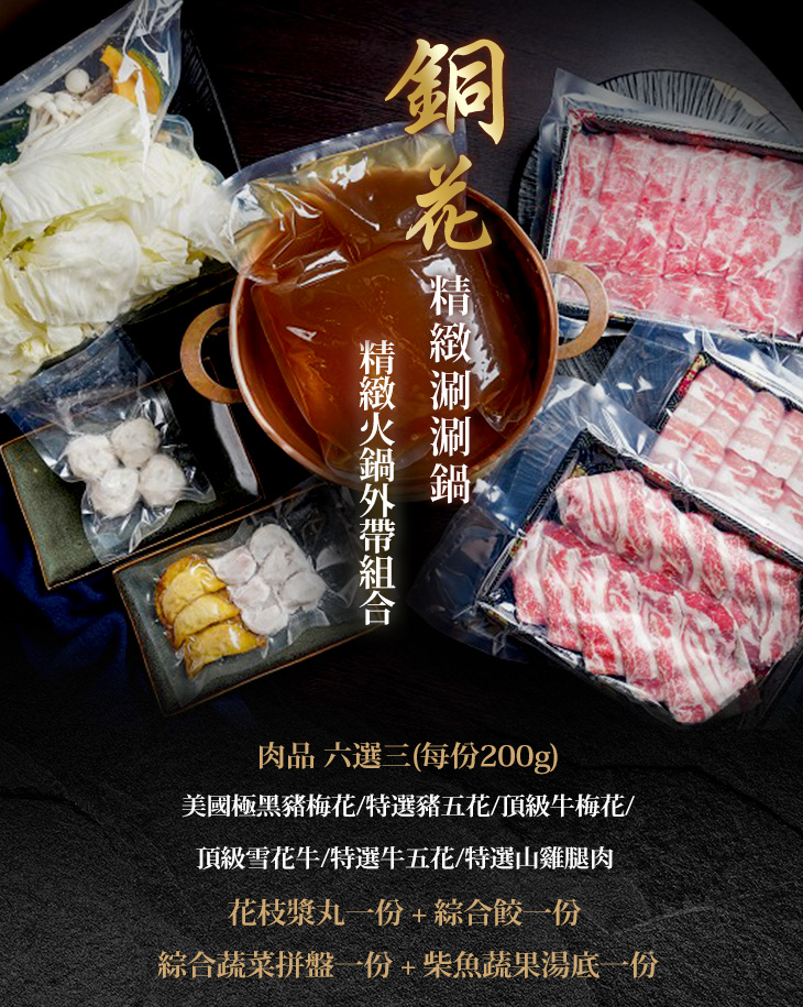 銅花精緻涮涮鍋以「吃鍋物,享幸福」的概念出發,堅持所有食材,絕對是最新鮮的美味!從慢火熬煮的火鍋湯底、台灣在地的健康時蔬、上等品質的各式肉類、以及絕對非嚐不可的新鮮海鮮,都是高品質的味覺享受!