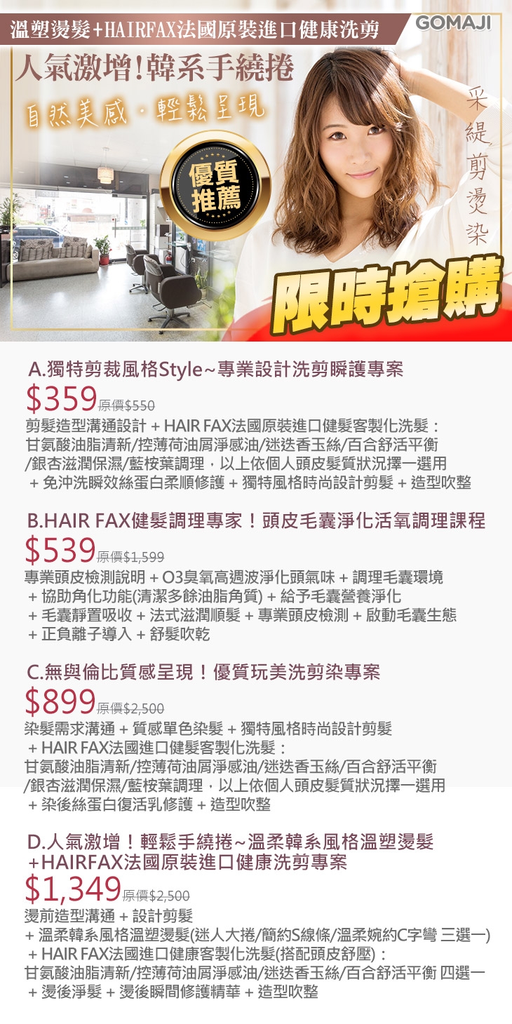 A.獨特剪裁風格Style~專業設計洗剪瞬護專案 / B.HAIR FAX健髮調理專家!頭皮毛囊淨化活氧調理課程 / C.無與倫比質感呈現!優質玩美洗剪染專案 / D.人氣激增!輕鬆手繞捲~溫柔韓系風格溫塑燙髮+HAIRFAX法國原裝進口健康洗剪專案