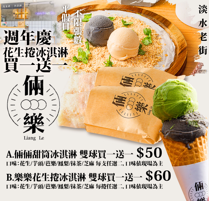 在充滿古早味的淡水老街中,有一間將古早味甜品重新以新手法製作的人氣冰品鋪──【倆樂花生捲冰淇淋(淡水老街店)】,招牌主打的花生捲冰淇淋,特別挑選營業50年以上老店舖的餅皮及花生磚,而裡頭關鍵的叭噗冰淇淋,則將台灣在地產的小農鮮果融入其中,打造出純天然、無添加的冰涼美味,讓這花生捲冰淇淋,不只是重現了回憶中美好的舊時光,更精緻的風味,讓人享受其中,用舌尖,體會前所未有的繽紛美味,讓花生捲冰淇淋,不再停留於過去的樣子,而是以更好的樣貌,重新走回您的生活中!