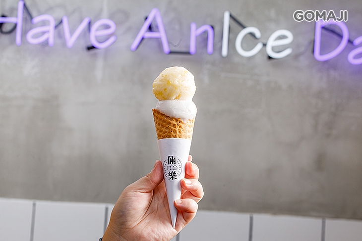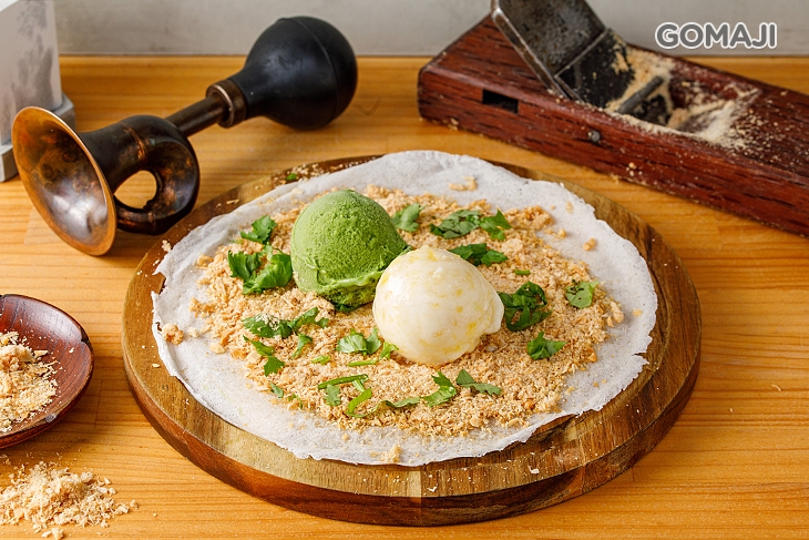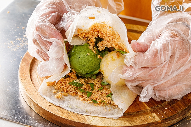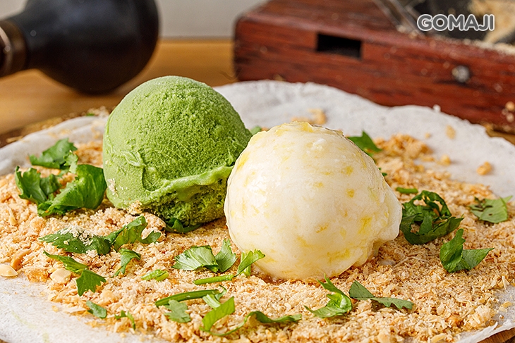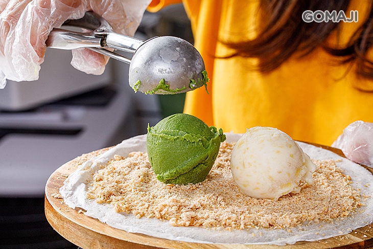 酸酸甜甜,吃起來好清爽的鳳梨口味,配上茶香濃厚、回甘不澀的抹茶口味,讓天然果香與茶味彼此交織出最美好的風味,抹茶雋永的香韻與鳳梨爽朗的果香形成巧妙的配搭,各自烘托出最美好的風貌,加上花生粉、香菜香氣四溢的點綴,讓這一份花生捲冰淇淋,充滿豐富的層次口感!
