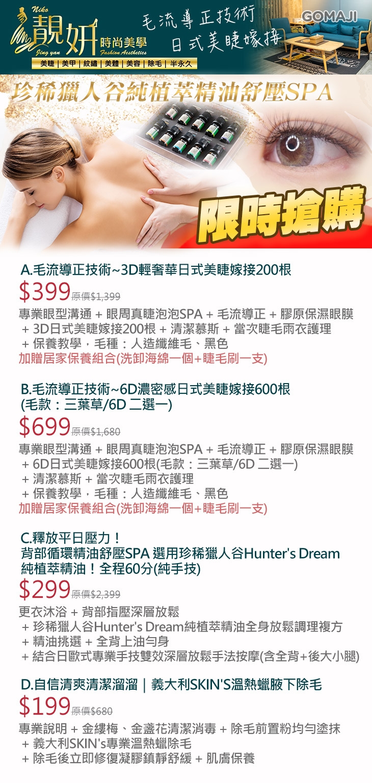 A.毛流導正技術~3D輕奢華日式美睫嫁接200根/B.毛流導正技術~6D濃密感日式美睫嫁接600根(毛款:三葉草/6D 二選一)/C.釋放平日壓力!背部循環精油舒壓SPA 選用珍稀獵人谷Hunter's Dream純植萃精油!全程60分(純手技)/D.自信清爽清潔溜溜|義大利SKIN'S溫熱蠟腋下除毛
