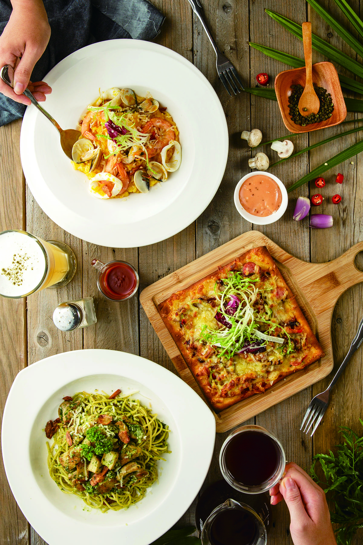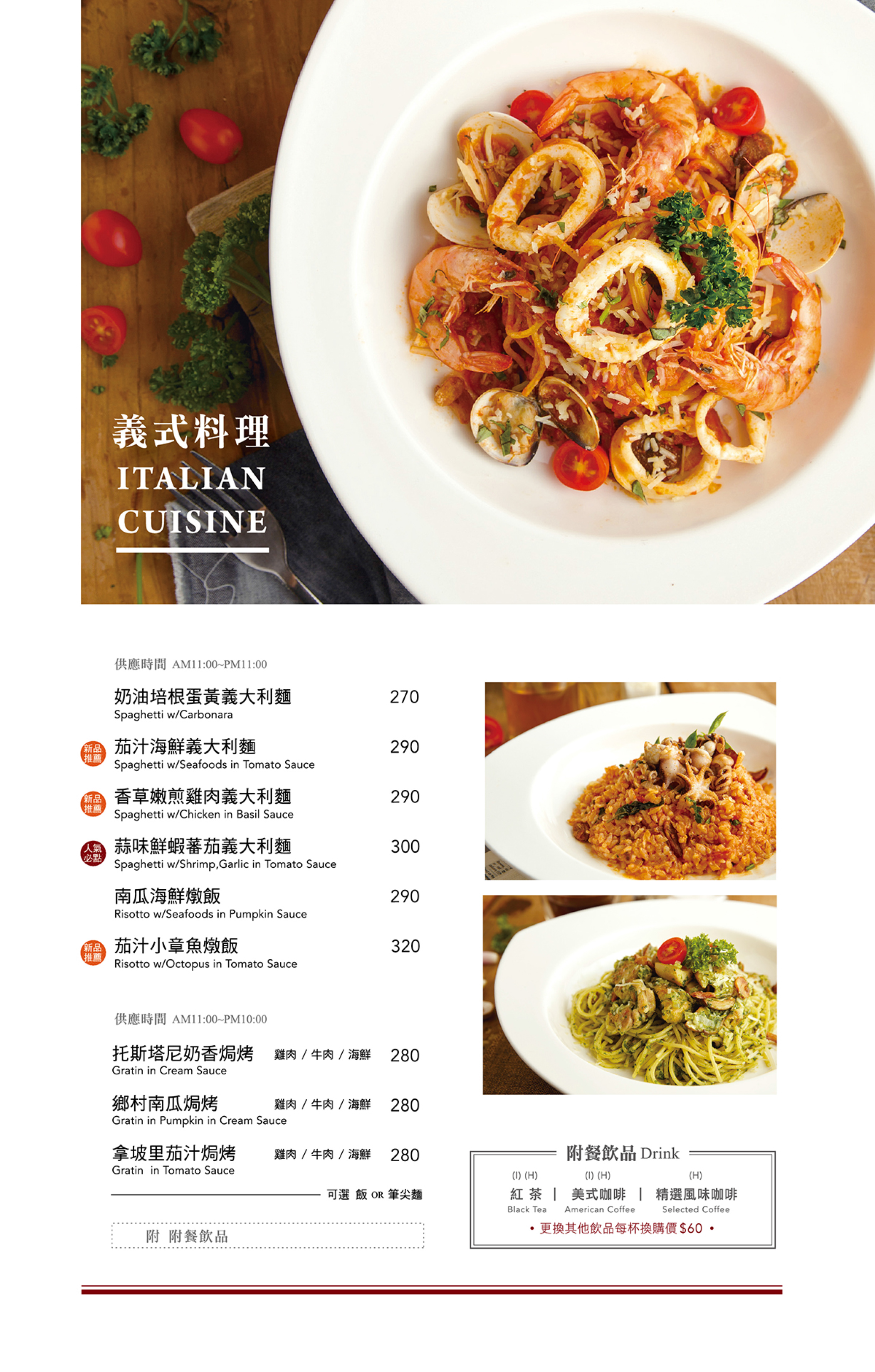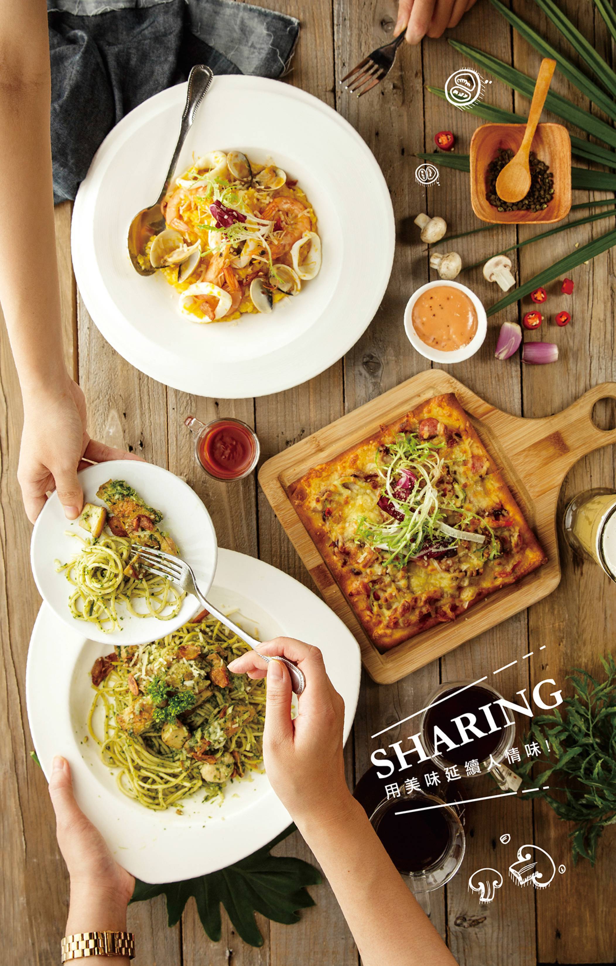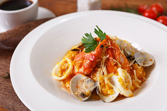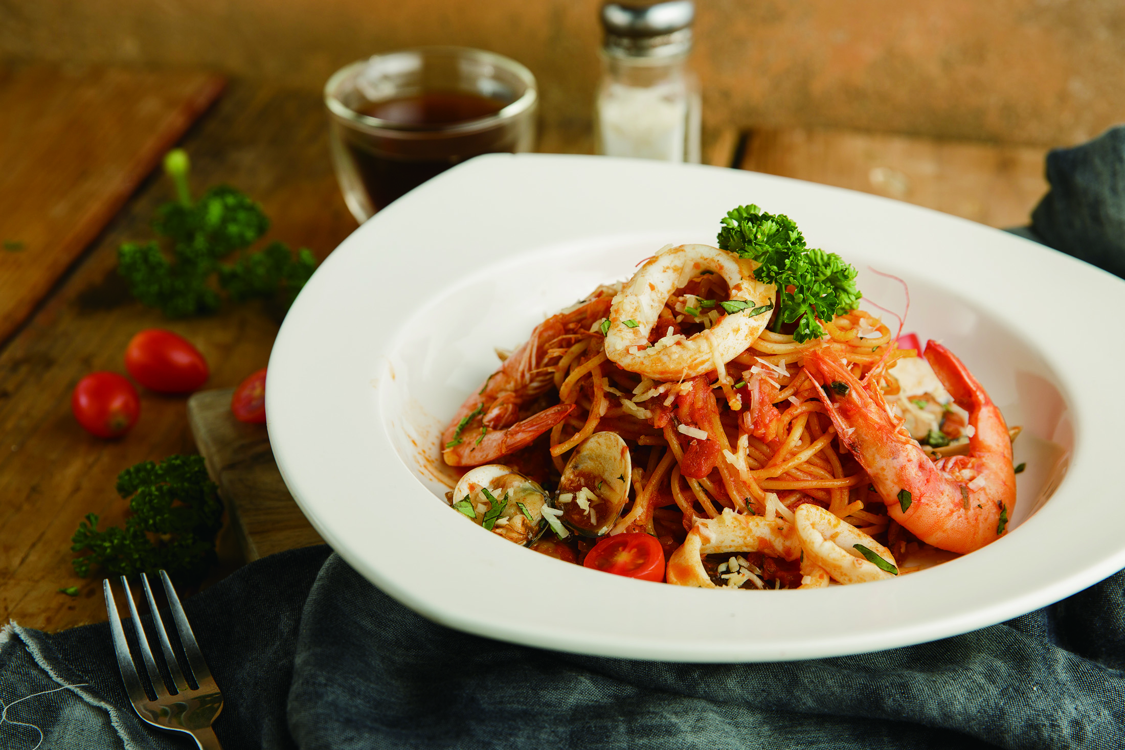 新鮮番茄熬煮的紅醬,搭配特選白蝦、透抽等海鮮食材拌炒,蔬果與大海交融的鮮甜風味,健康美味首選!