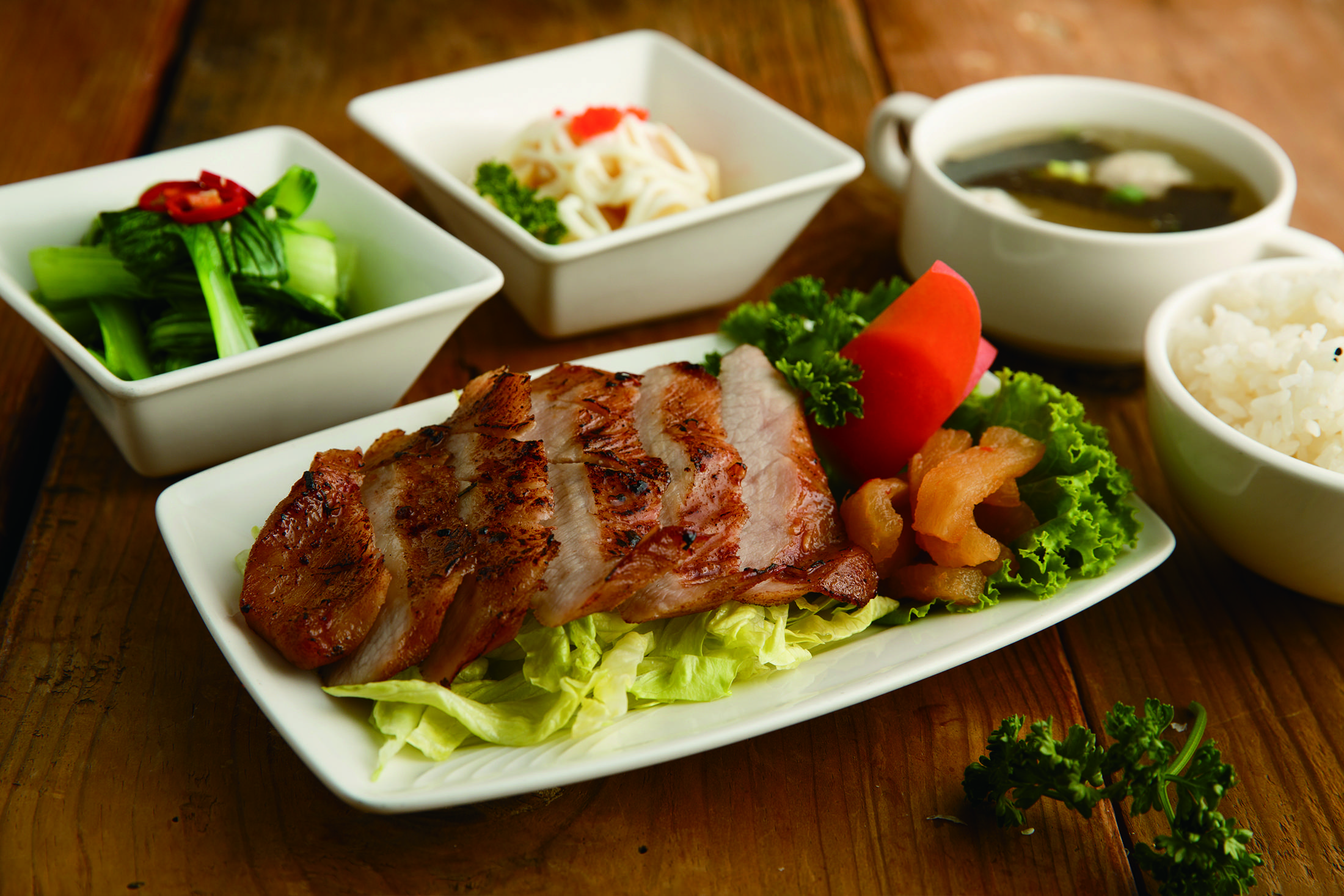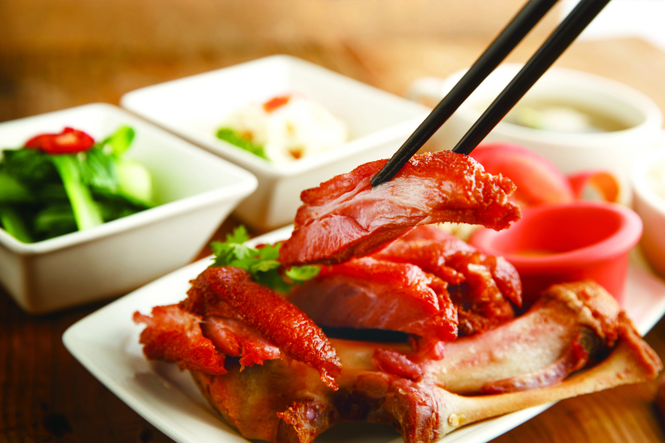 將松阪豬以帶有脂香及酒香的南乳醬調和五香粉醃漬,放入烤箱慢烤至表皮焦香酥脆,內裡的肉質呈現淡粉紅色,香甜美味!