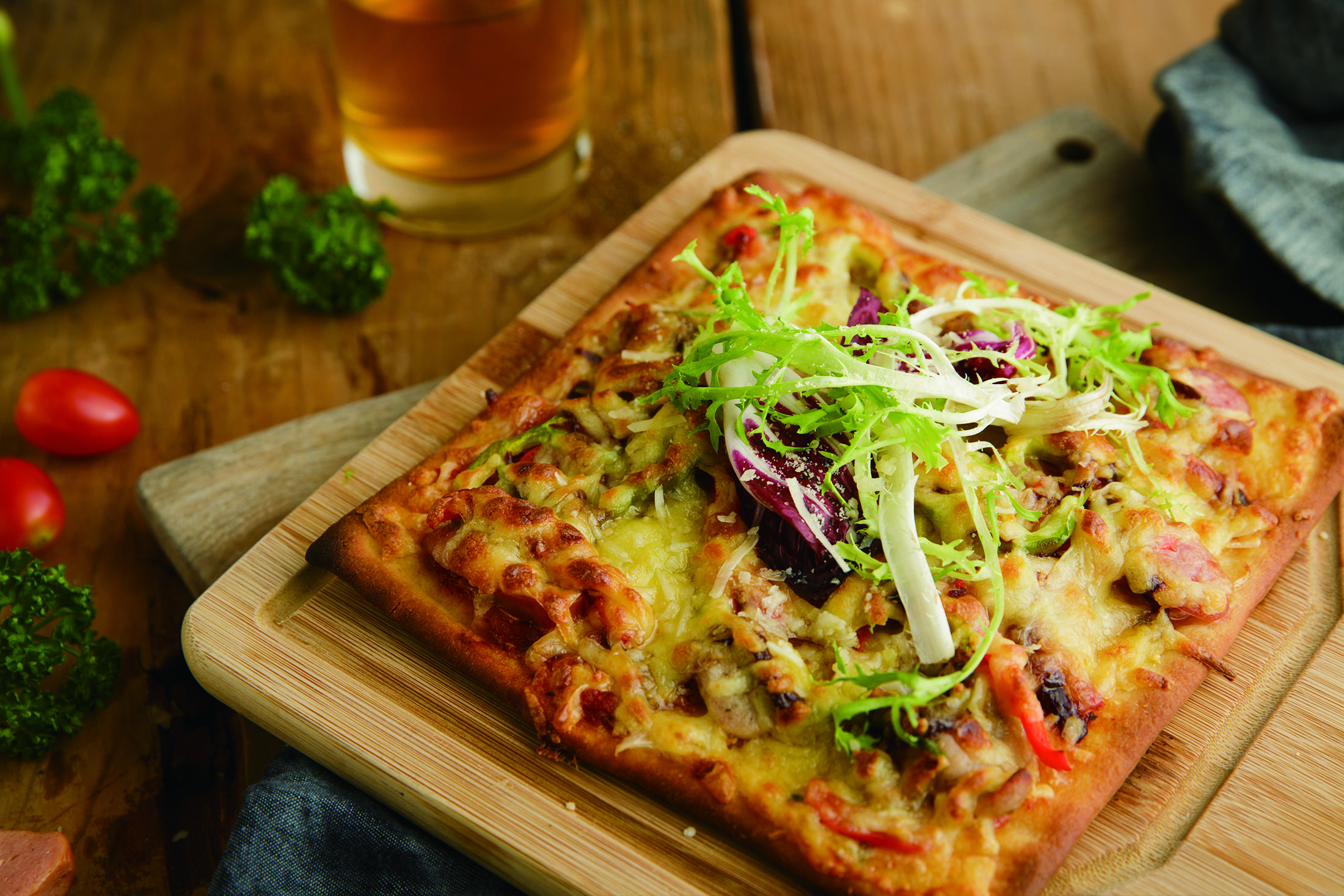 扁平方形的義式披薩,特別的薄脆享受,美味好料通通加入,伴著起司鹹香濃郁與煙燻臘腸的好味道,令人吮指再三!