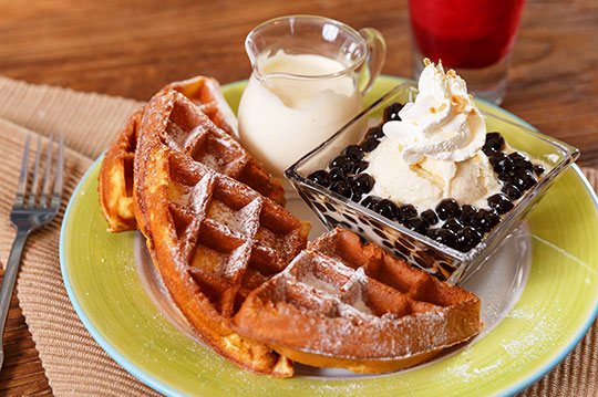自製手工鬆餅糊,在現煮的蜂蜜珍珠上淋滿鮮奶油及起司調製的奶霜醬,濃郁蛋奶香氣,Q彈綿密,就像珍珠奶茶配原味鬆餅的下午茶饗宴。