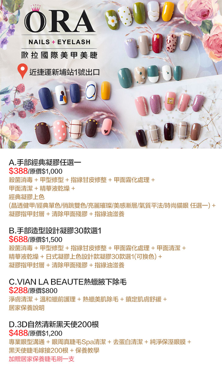 A.手部經典凝膠任選一 / B.手部造型設計凝膠30款選1 / C.VIAN LA BEAUTE熱蠟腋下除毛 / D.3D自然清新黑天使200根