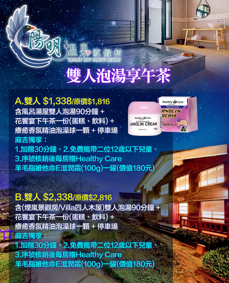 ★ 麻吉獨享:序號核銷後每房贈Healthy Care羊毛脂維他命E滋潤霜(100g)一罐(價值180元)