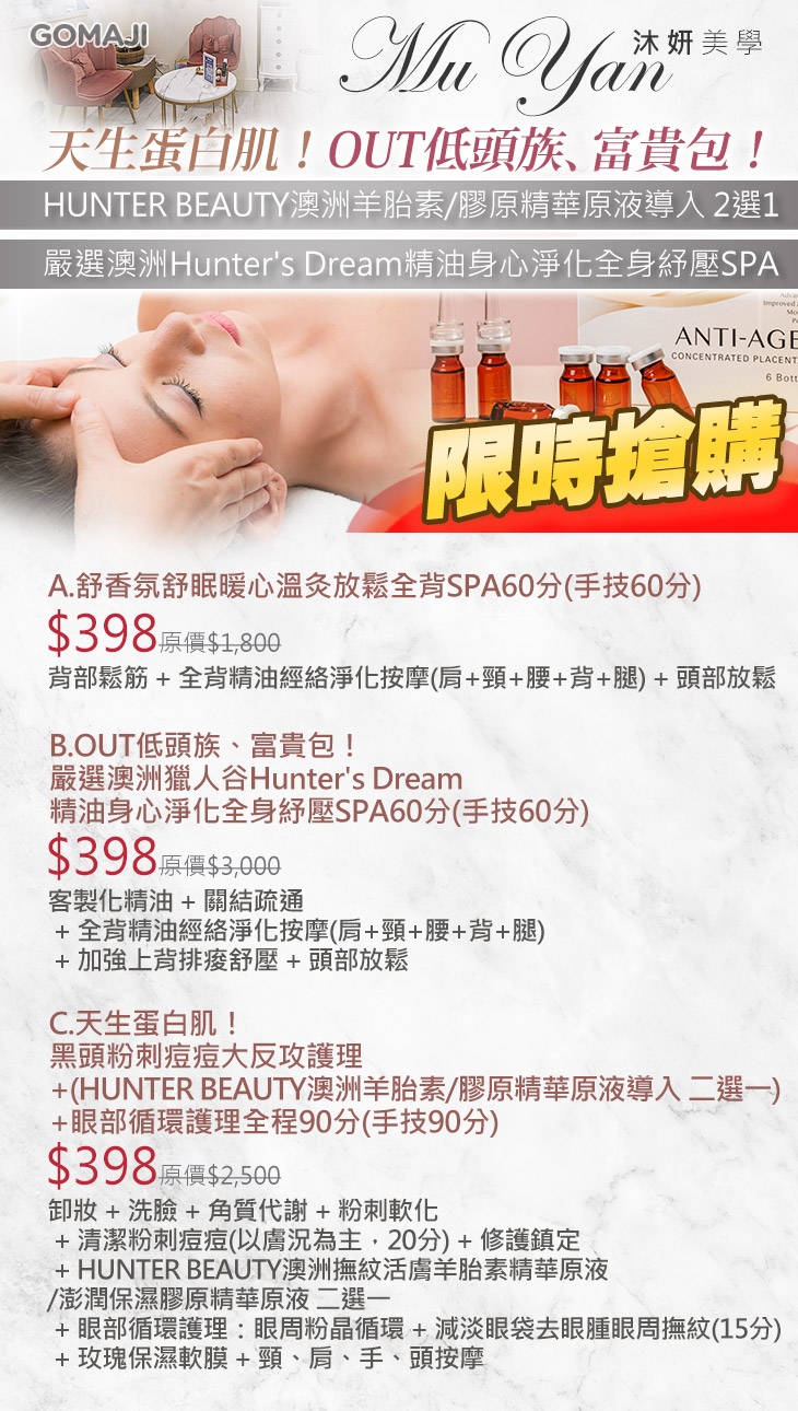 A.舒香氛舒眠暖心溫灸放鬆全背SPA60分(手技60分) / B.OUT低頭族、富貴包!嚴選澳洲獵人谷Hunter's Dream精油身心淨化全身紓壓SPA60分(手技60分) / C.天生蛋白肌!黑頭粉刺痘痘大反攻護理+(HUNTER BEAUTY澳洲羊胎素/膠原精華原液導入 二選一)+眼部循環護理全程90分(手技90分)