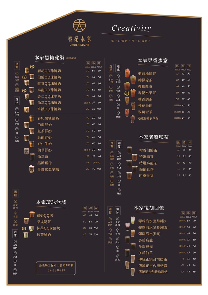 ◆ 春紀本家產品標榜採用醇厚的鮮奶與獨門製作的黑糖所調和而成的飲品,除此之外更有春紀本家獨有的本家黑糖奶蓋為大部份的產品做完美的點綴,無論在外觀、口味都帶給消費者完全不同於一般手搖飲的全新感受。