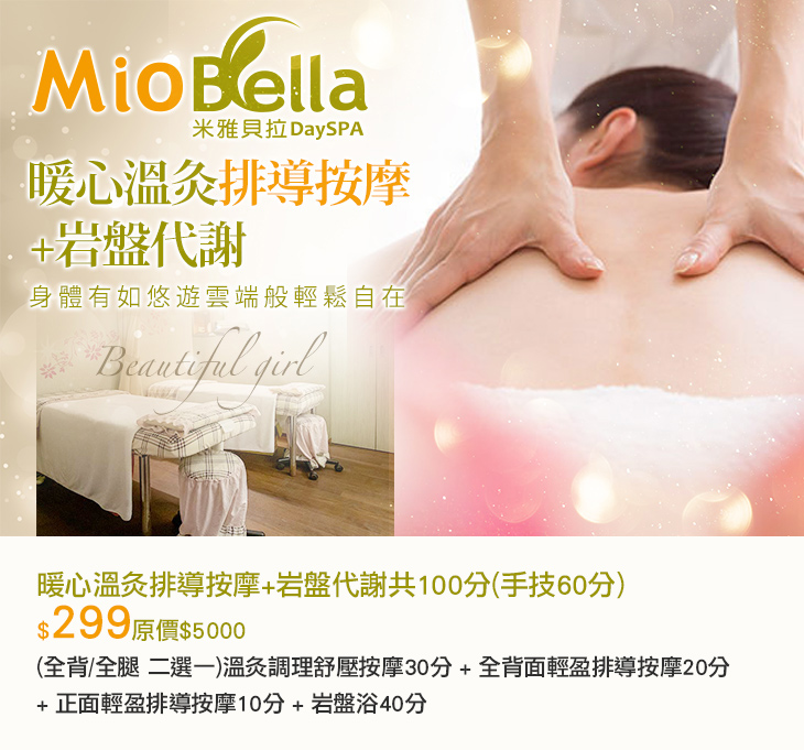 〈(全背/全腿 二選一)溫灸調理舒壓按摩30分 + 全背面輕盈排導按摩20分 + 正面輕盈排導按摩10分 + 岩盤浴40分〉