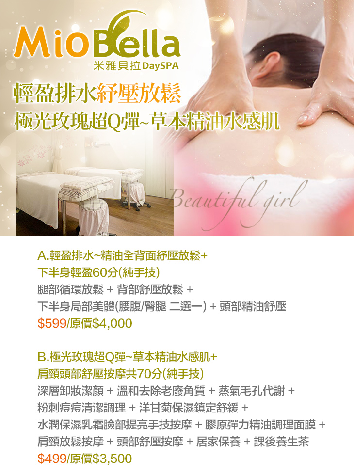 A.輕盈排水~精油全背面紓壓放鬆+下半身輕盈60分(純手技) / B.極光玫瑰超Q彈~草本精油水感肌+肩頸頭部舒壓按摩共70分(純手技)