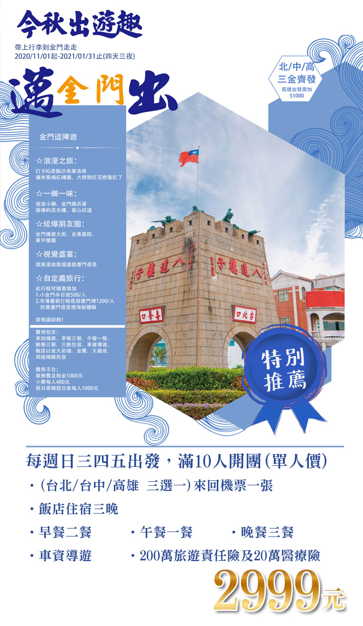 只要2999元,即可享有【金門遊4天3夜(晚去早回)】北/中/高皆飛,每週日三四五出發,滿10人開團(單人價)〈含(台北/台中/高雄 三選一)來回機票一張 + 飯店住宿三晚 + 早餐二餐 + 午餐一餐 + 晚餐三餐 + 車資導遊 + 200萬旅遊責任險及20萬醫療險〉