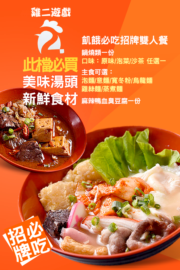 飢腸轆轆的時候,來一份經濟實惠的銅板美食最對味!【雞二遊戲】座落於新竹市東區建功路上,以「最佳的銅板美食」為目標,主打鹽水雞、油雞、鍋燒麵、麻辣燙等各樣平價樸實的餐點。新鮮的用料、每日精燉的入味湯頭,不添加人工味精,要給您兼具健康、美味,以及價格的絕品美食!肚子咕嚕咕嚕叫了嗎?不妨來【雞二遊戲】欽點一份餐點來品嚐吧!