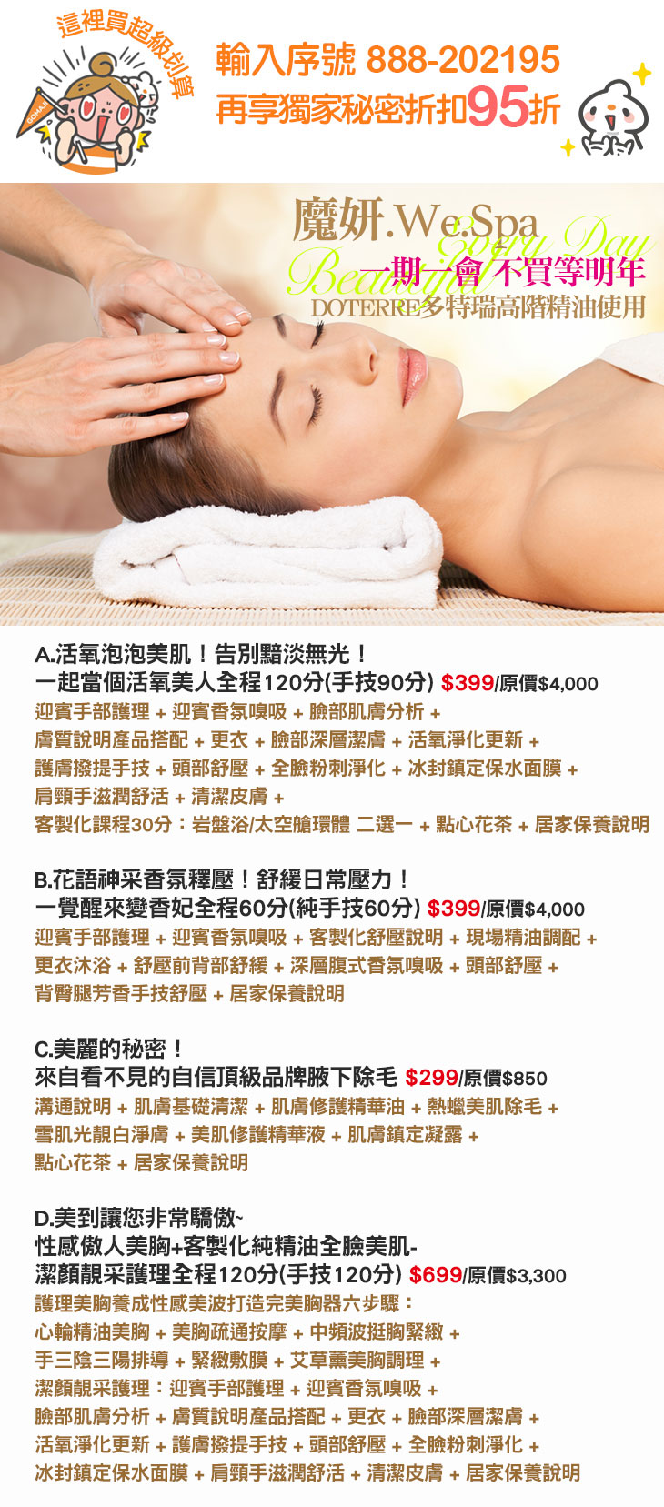 A.活氧泡泡美肌!告別黯淡無光!一起當個活氧美人全程120分(手技90分) / B.花語神采香氛釋壓!舒緩日常壓力!一覺醒來變香妃全程60分(純手技60分) / C.美麗的秘密!來自看不見的自信頂級品牌腋下除毛 / D.美到讓您非常驕傲~性感傲人美胸+客製化純精油全臉美肌-潔顏靚采護理全程120分(手技120分)
