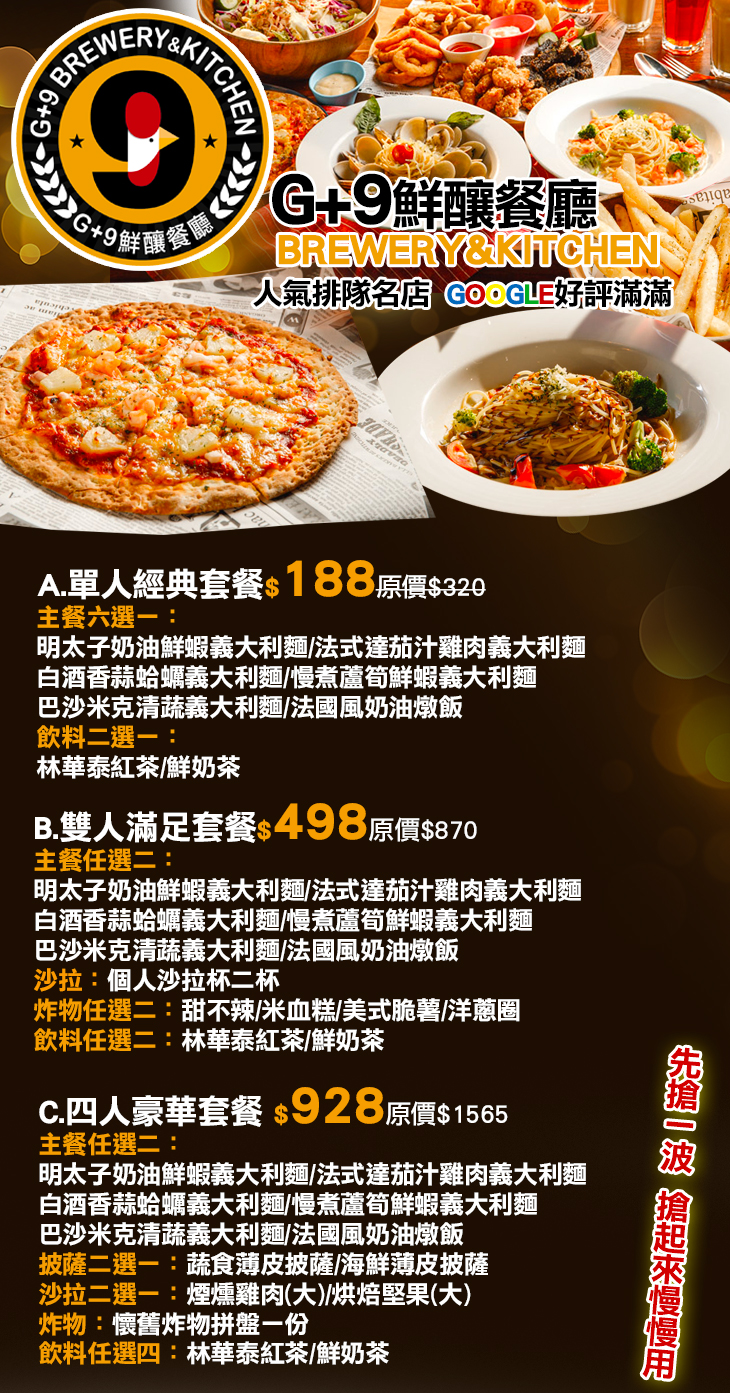 品一口精釀,嚐一口美食,讓歡笑留下,把愉悅帶走,「像在家一般放鬆」, 是我們衷心希望帶給顧客的感受。從義大利麵、台式炸物到川味麻辣燙, 搭配一杯台灣自製的新鮮精釀風味,身心靈都感到無比滿足!如果您正在找一間燈光美、氣氛佳、環境舒適、餐點美味且適合多人聚會的餐廳,那一定要大推這間G+9,趁著工作之餘好好享受一下吧!G+9期待與您一同創造最美麗的回憶唷!