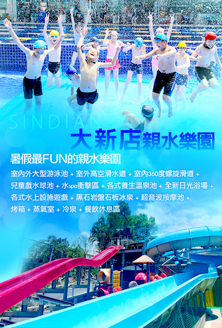 【大新店親水樂園】位在新店溪河畔,緊鄰碧潭大橋,風光水色優美,提供一個安全、健康、快樂的休閒場所,附屬的大型停車場更是便利了開車前來的朋友!大台北最大的游泳池之一,佔地約2000坪,有50公尺標準室外池、25公尺標準室內溫水池、三溫暖、水療SPA按摩、各式藥浴溫泉、室內親子電影院、室內親子溫水教學池等設備並附設廣大停車場,以最平價的消費帶給所有人最快樂、健康的享受!