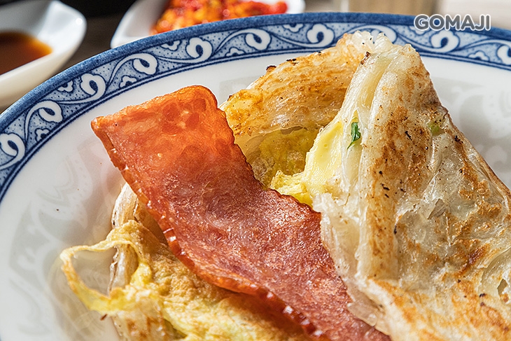 煎得鹹香濃郁的火腿,搭配蛋香四溢的煎蛋,以及精心手製的酥香蔥抓餅,外酥內嫩、肉香豐盈的好味道,在一入口品嚐時便充斥著齒唇之間,讓人不禁食指大動、胃口大開!簡單、不譁眾取寵的美味,絲絲滲入人心,比起五星級餐廳中精緻華麗的餐點,這一份手工黃金蔥抓餅,更讓人動人!